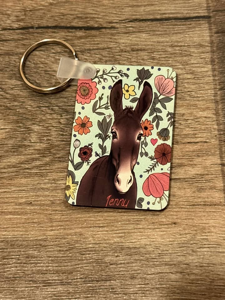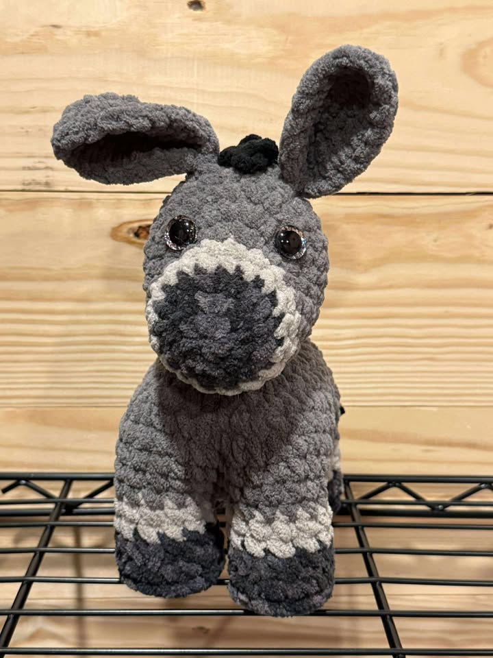 This box contains a large handmade stuffy of our sanctuary donkey Jenny, a coffee mug with her on it, a keychain with her on it, 2 color sheets, a adoption certificate, and a mystery item.